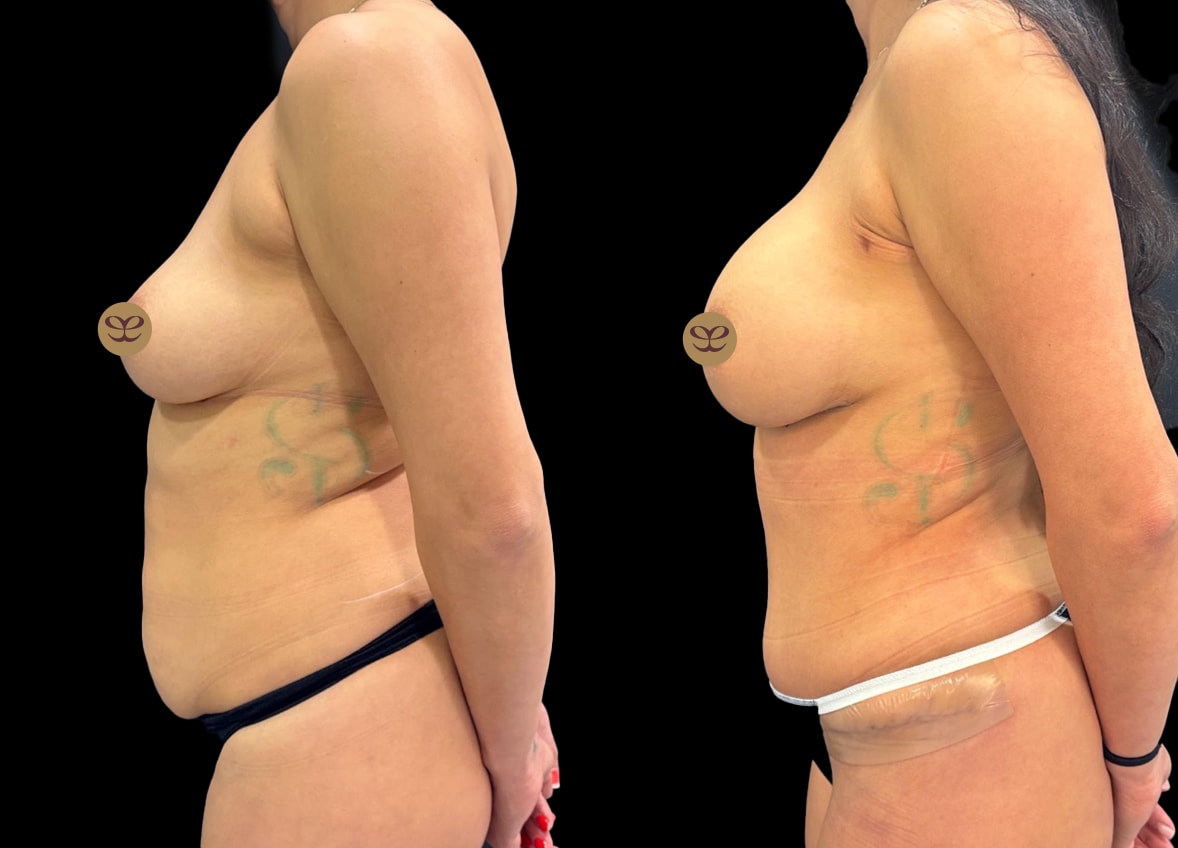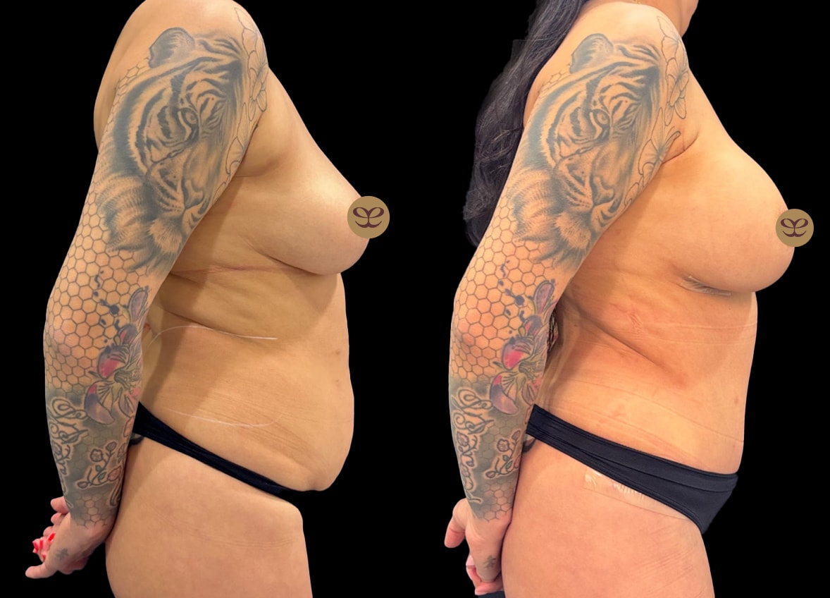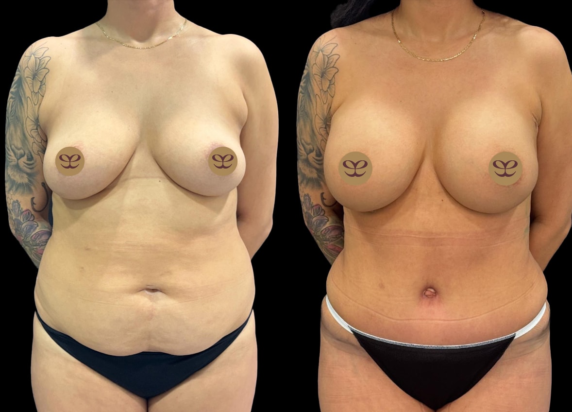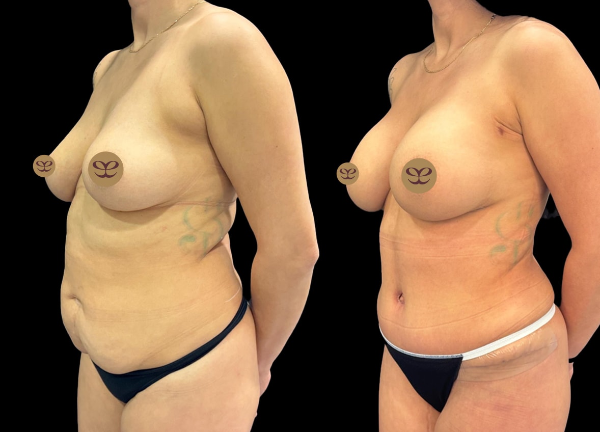 During a single surgical session, Dr. Dorafshar meticulously performed all three procedures. For the breast augmentation, 265cc Ergonomix Demi Motiva nano-textured breast implants were strategically placed under the muscle (subpectoral) to achieve a natural yet enhanced appearance. Concurrently, 360-degree liposuction was executed to sculpt and contour the body, targeting areas of stubborn fat around the entire torso. This was followed by an abdominoplasty, or “tummy tuck,” which involved the removal of excess skin and fat from the abdomen and the tightening of the abdominal muscles, restoring a firmer, more toned midsection.