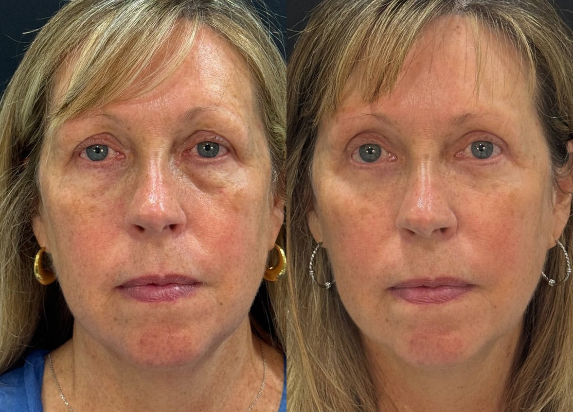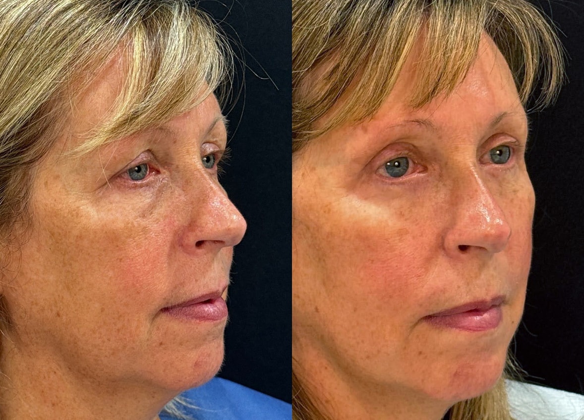The brow lift aimed to elevate and reposition the eyebrows to a more youthful and natural arch, which can indirectly improve the appearance of the upper eyelids. The upper blepharoplasty procedure focused on removing excess skin and fat from the upper eyelids, directly addressing the patient’s complaint of fullness. Dr. Dorafshar employed specialized techniques during the upper blepharoplasty to directly thin the subcutaneous tissue beneath the eyebrows, further contributing to a reduction in upper eyelid fullness and creating a smoother contour.