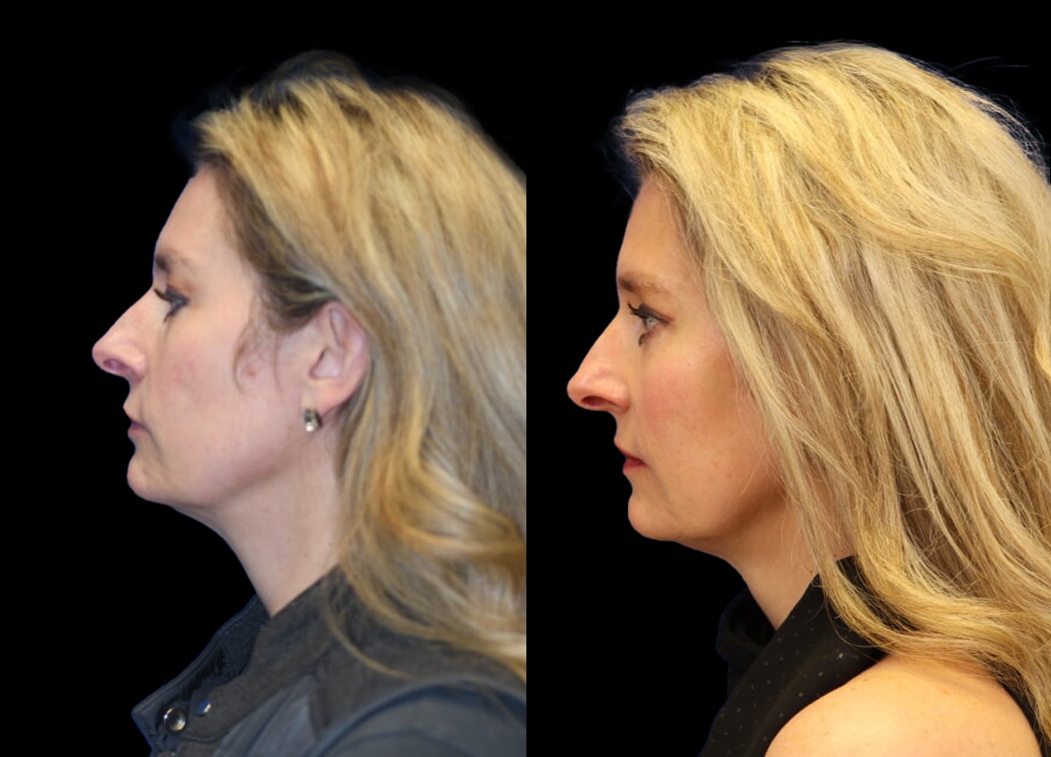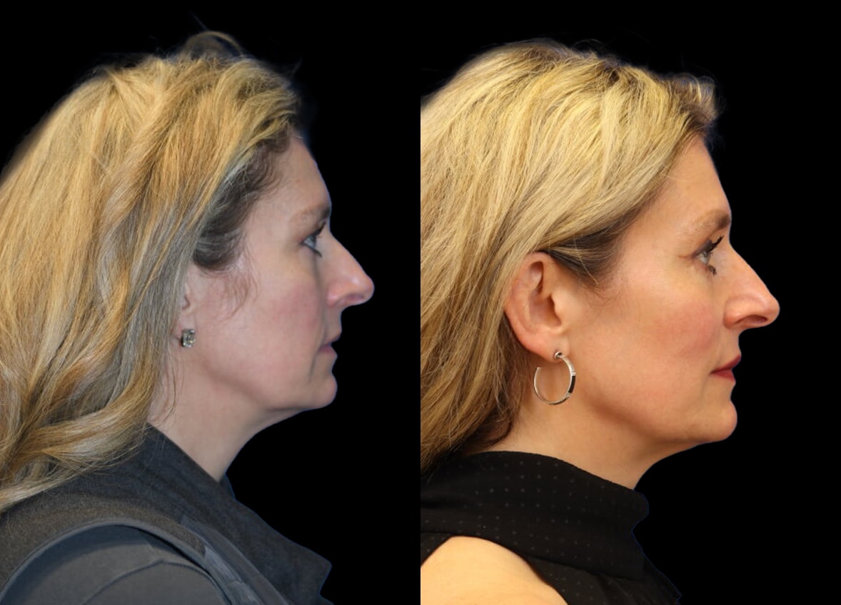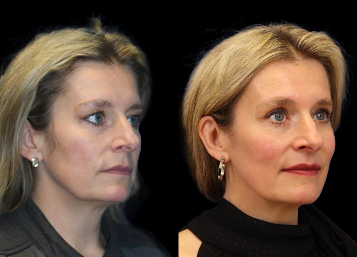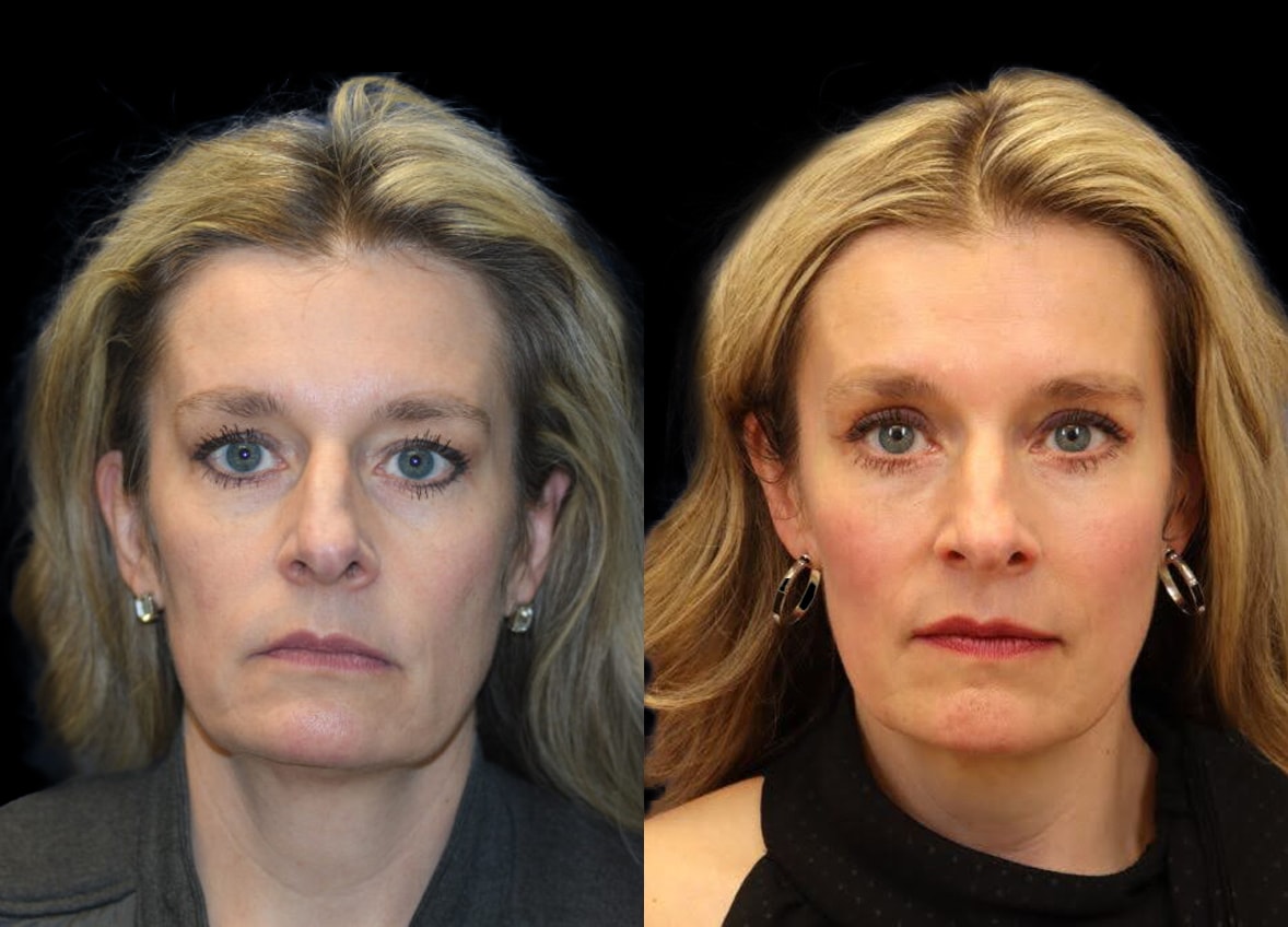 This elegant woman sought our expertise due to a persistent concern: “heavy” upper eyelids that not only contributed to a fatigued appearance but also added years to her perceived age. Beyond the upper eyelid concerns, she expressed dissatisfaction with the subtle hollowing and prominent tear troughs beneath her lower eyelids, desiring a more invigorated and youthful aesthetic.