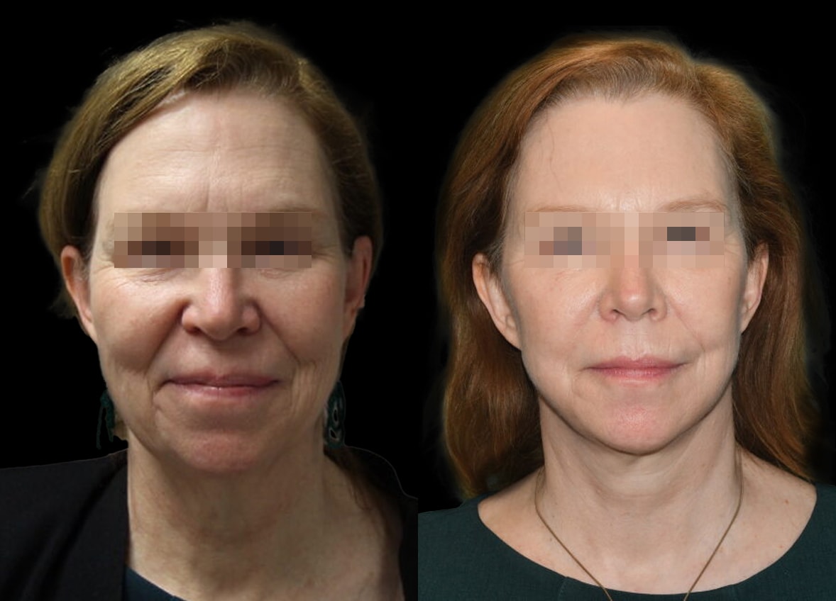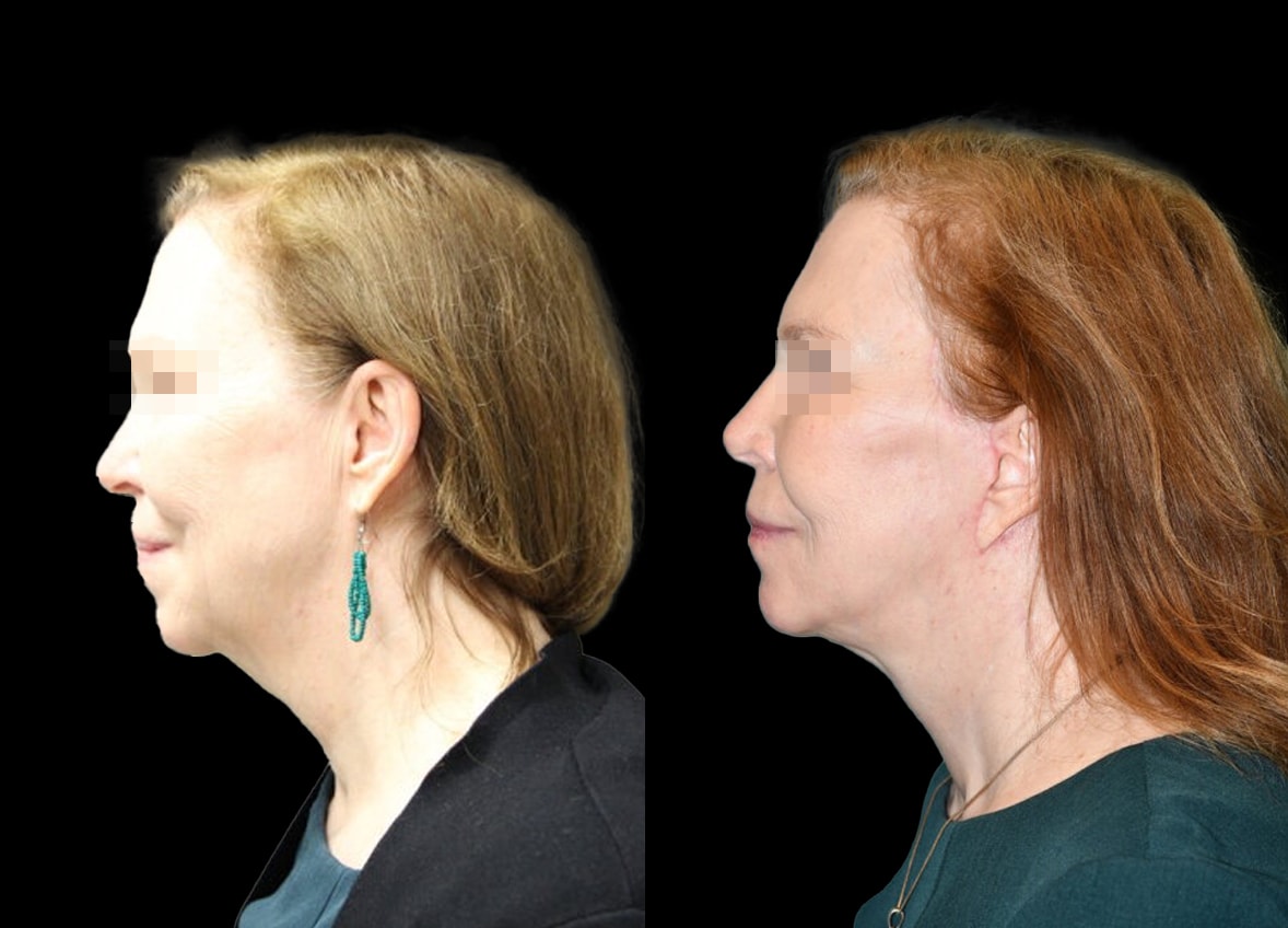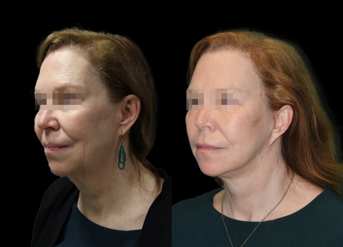 In addition to the deep plane facelift, liposuction to her neck was performed. This targeted procedure effectively refined the contour of her jawline and neck, eliminating excess fat and creating a more defined and youthful profile. The combination of these two procedures was designed to harmonize her facial features, creating a cohesive and naturally refreshed appearance.