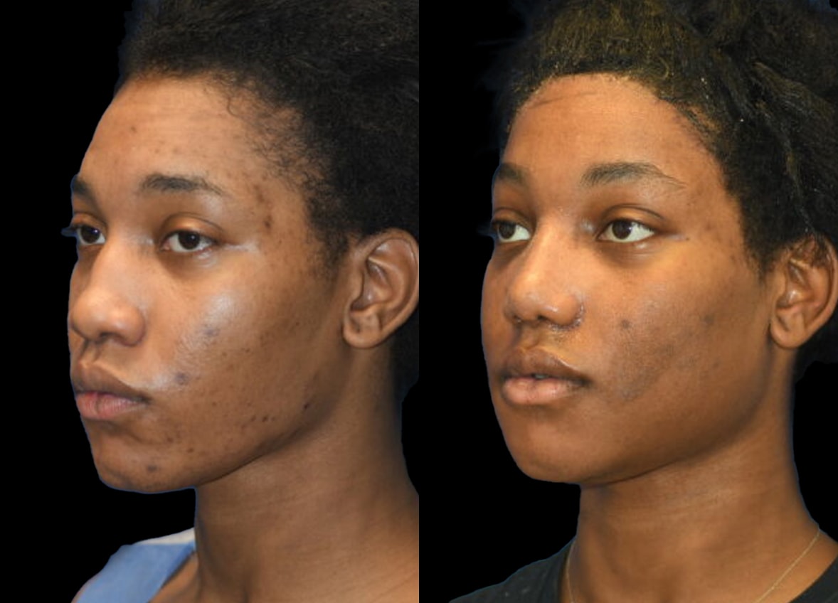 During this comprehensive facial feminization surgery, Dr. Dorafshar meticulously addressed multiple aspects of the patient’s facial structure to align with her gender identity. The procedure included a frontal sinus setback, carefully reshaping the upper forehead and brow area for a softer, more feminine contour. A brow lift was performed to elevate the eyebrows to a more traditionally feminine arch and position, contributing to a more open and youthful appearance around the eyes. To further refine the upper facial features, a hairline advancement was carried out, likely involving moving the hairline to create a softer and more feminine shape and potentially reducing the appearance of a higher forehead. The rhinoplasty component of the surgery focused on reshaping the nose, refining its size, shape, and profile to harmonize with the newly feminized facial features. Finally, a genioplasty was performed, which involved reshaping the chin to achieve softer and more feminine proportions, often by reducing its size or altering its projection. The successful combination of these procedures has resulted in the patient looking amazing and expressing a profound sense of comfort and affirmation in her gender identity.