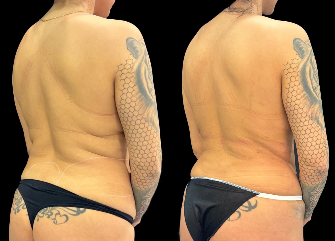 During a single surgical session, Dr. Dorafshar meticulously performed all three procedures. For the breast augmentation, 265cc Ergonomix Demi Motiva nano-textured breast implants were strategically placed under the muscle (subpectoral) to achieve a natural yet enhanced appearance. Concurrently, 360-degree liposuction was executed to sculpt and contour the body, targeting areas of stubborn fat around the entire torso. This was followed by an abdominoplasty, or “tummy tuck,” which involved the removal of excess skin and fat from the abdomen and the tightening of the abdominal muscles, restoring a firmer, more toned midsection.