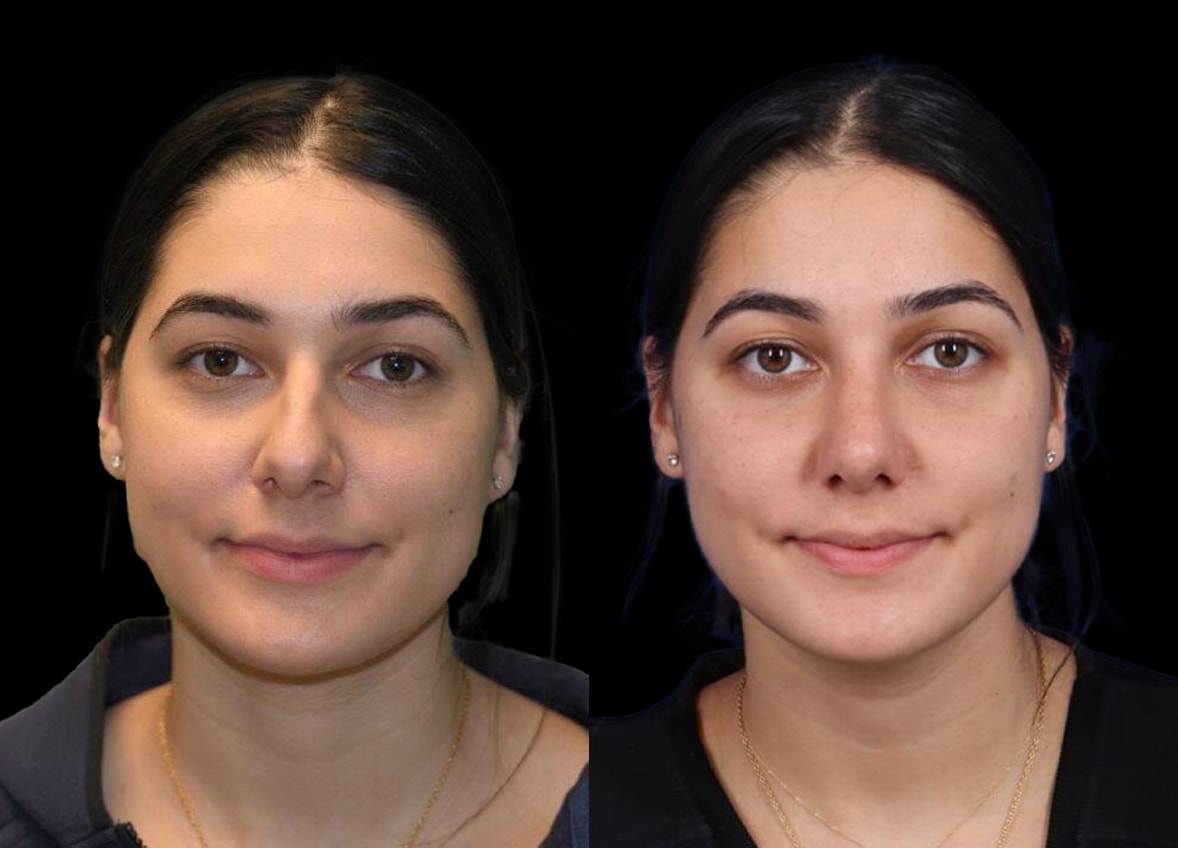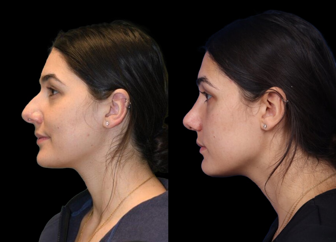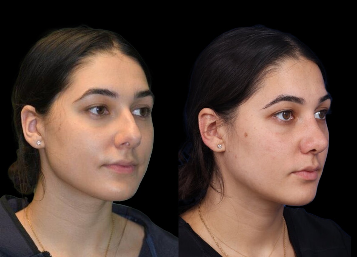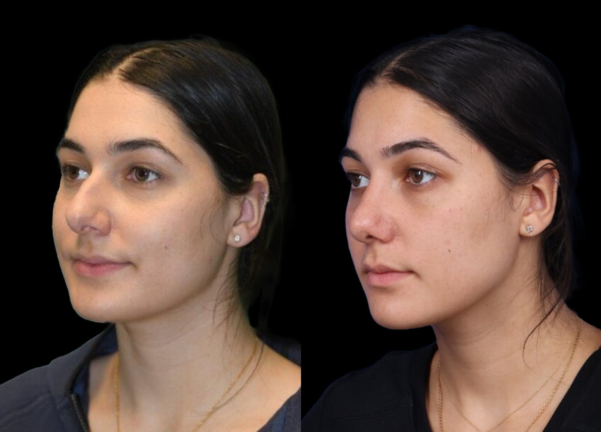 During the procedure, Dr. Dorafshar meticulously addressed the dorsal hump, carefully reducing its prominence to create a smoother, more elegant nasal bridge. Employing a sophisticated combination of meticulously sculpted cartilage grafts and sutures, the nasal tip was artfully elevated, contributing to a more refined and lifted appearance. A delicate supratip break was meticulously crafted, adding a subtle, aesthetically pleasing indentation that defines the transition between the nasal bridge and the tip. Furthermore, the nasal alar was refined and made smaller through expertly executed Weir alar base excisions, harmonizing the overall width of the nose with her facial features.