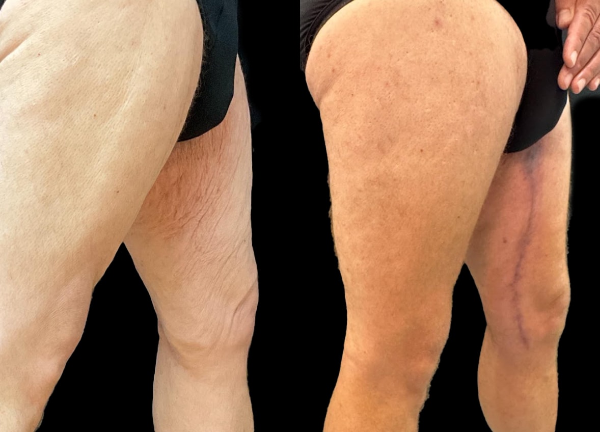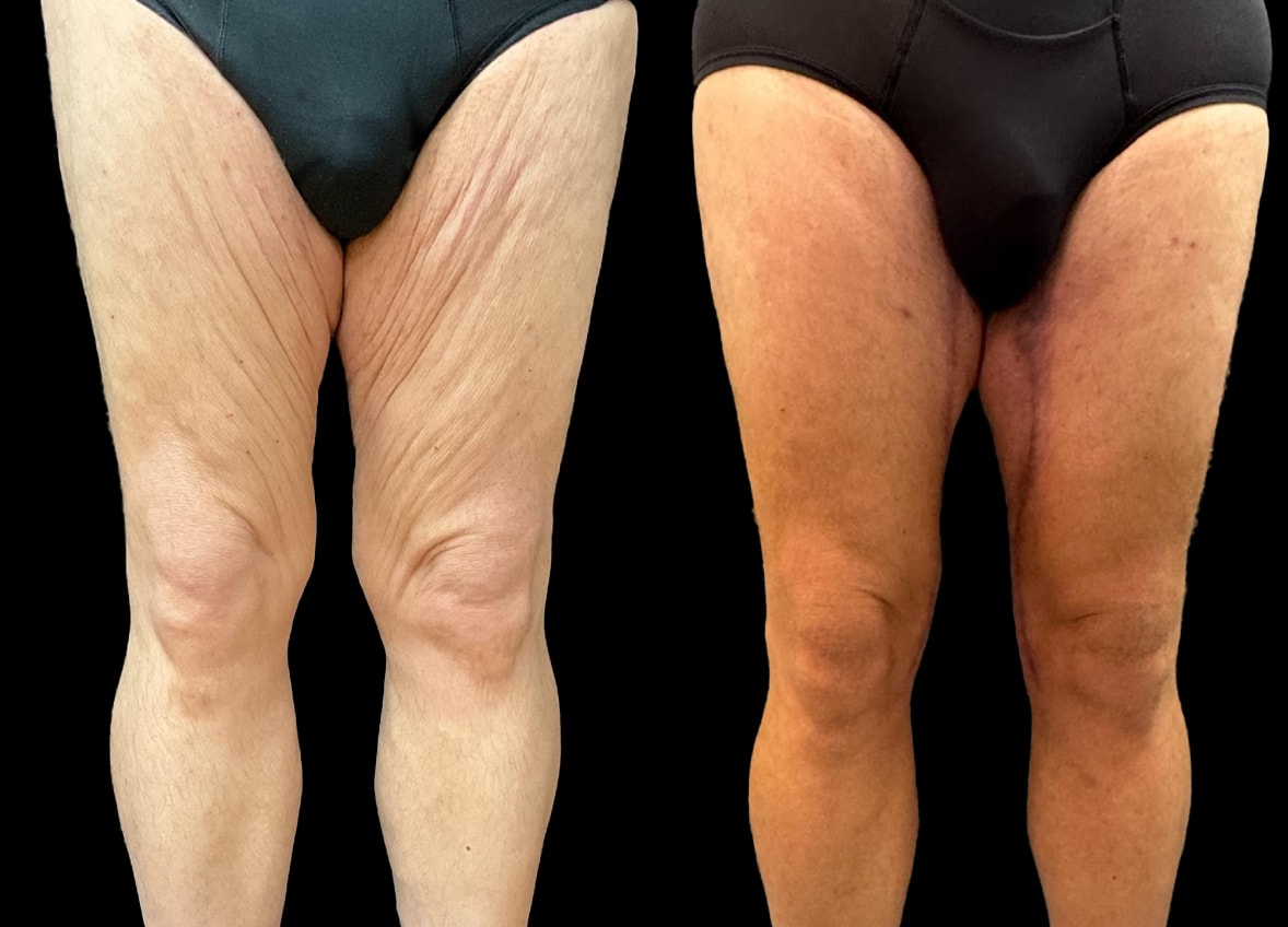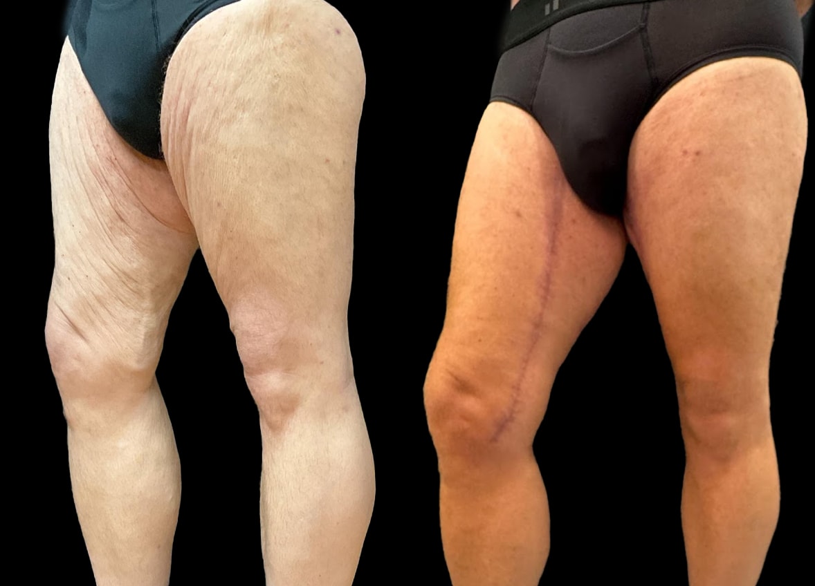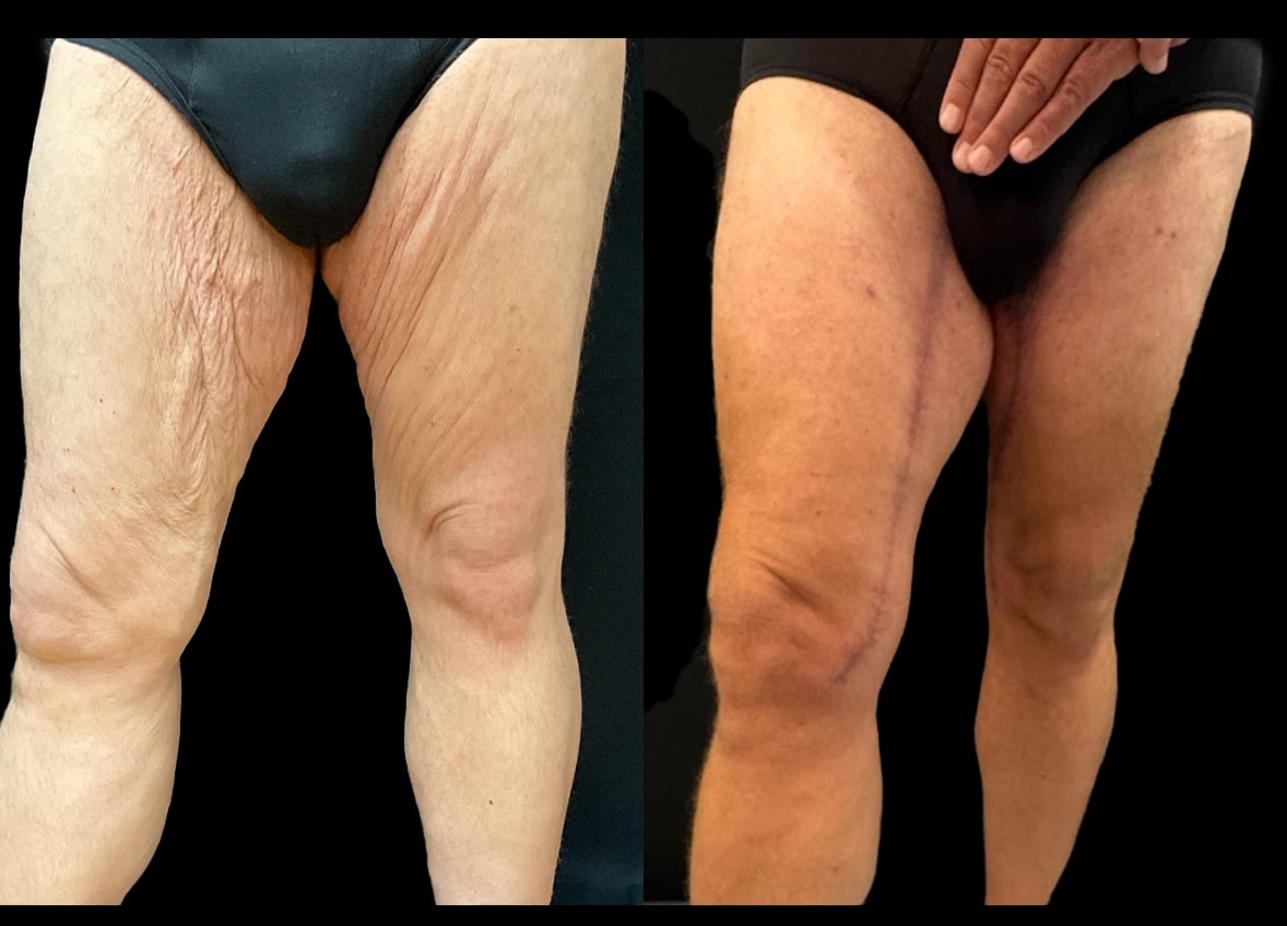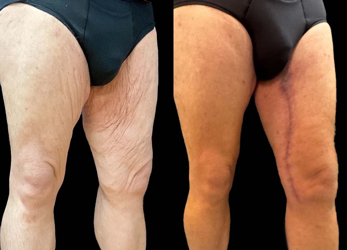After a thorough and detailed consultation with Dr. Dorafshar, where all available treatment options, potential risks, and expected outcomes were comprehensively discussed, the patient opted for a combined surgical approach. This comprehensive plan included a full abdominoplasty to meticulously address the excess skin and laxity in the trunk area, which also served to lift and reshape his mons. Concurrently, a thighplasty was performed to remove the redundant skin on his thighs, thereby improving their overall contour and proportion. Additionally, adjunctive liposuction was utilized in targeted areas to further refine the body shape, meticulously sculpting and addressing localized pockets of excess fat that were resistant to diet and exercise. The synergistic effect of these procedures was designed to achieve a harmonious and aesthetically pleasing outcome.